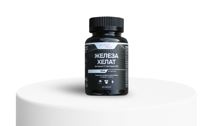 - «Хелат железа + витамин С + B3». Физиологическая поддержка при дефиците железа и низком гемоглобине. Хелатная форма усваивается без нагрузки на ЖКТ, а витамины усиливают кроветворение и возвращают энергию.